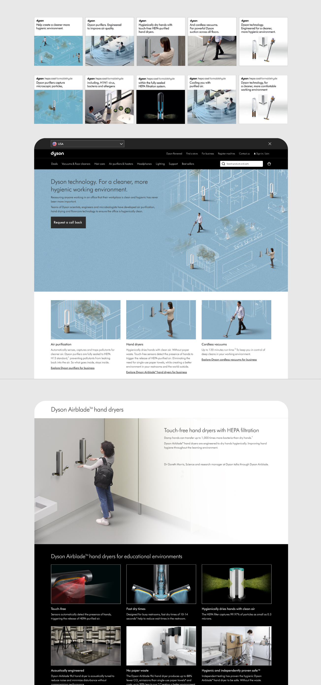 This was the largest revamp we did in B2B during my time at Dyson. It was aimed at our main business audiences; education and offices, focusing on hygiene in the workplace. The campaign consisted of webpages, digital display advertising, social media and emails. Below is an example of a SEE and THINK route for social carousels followed by the campaign web page. The SEE route contained the overall messaging for the campaign while the THINK route delved deeper into the USP of the product and how it solved the problem.